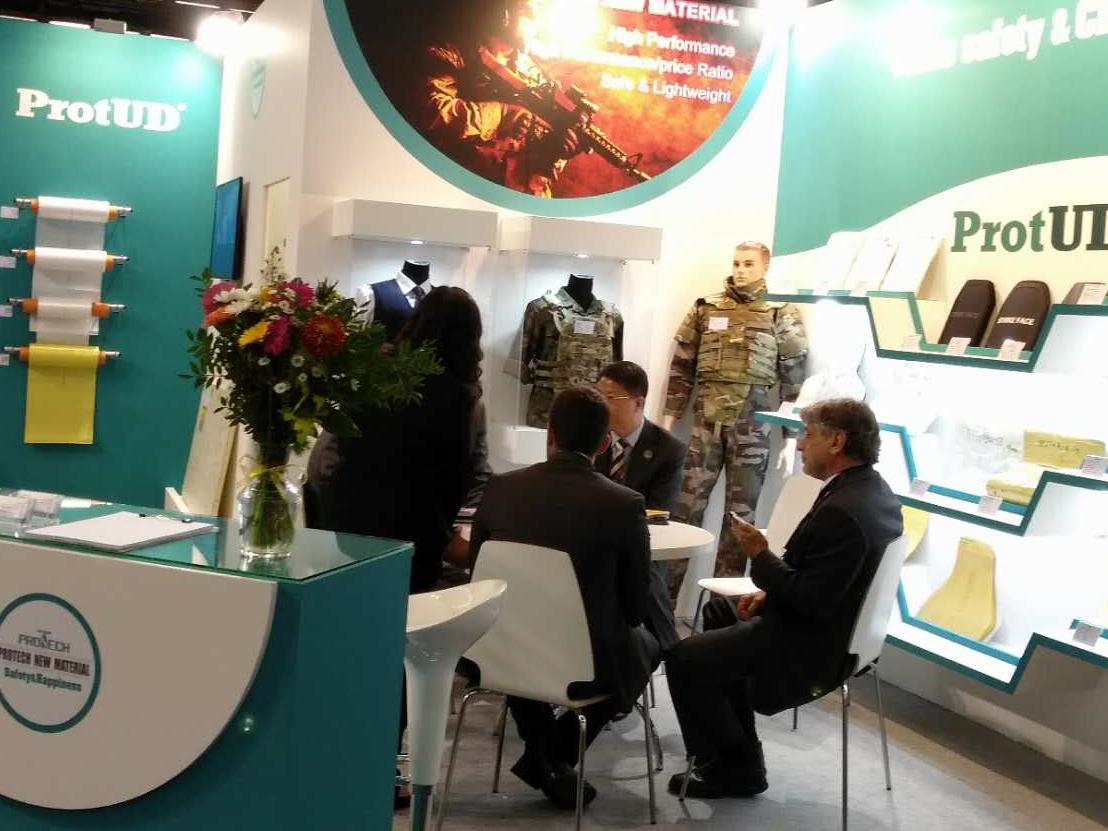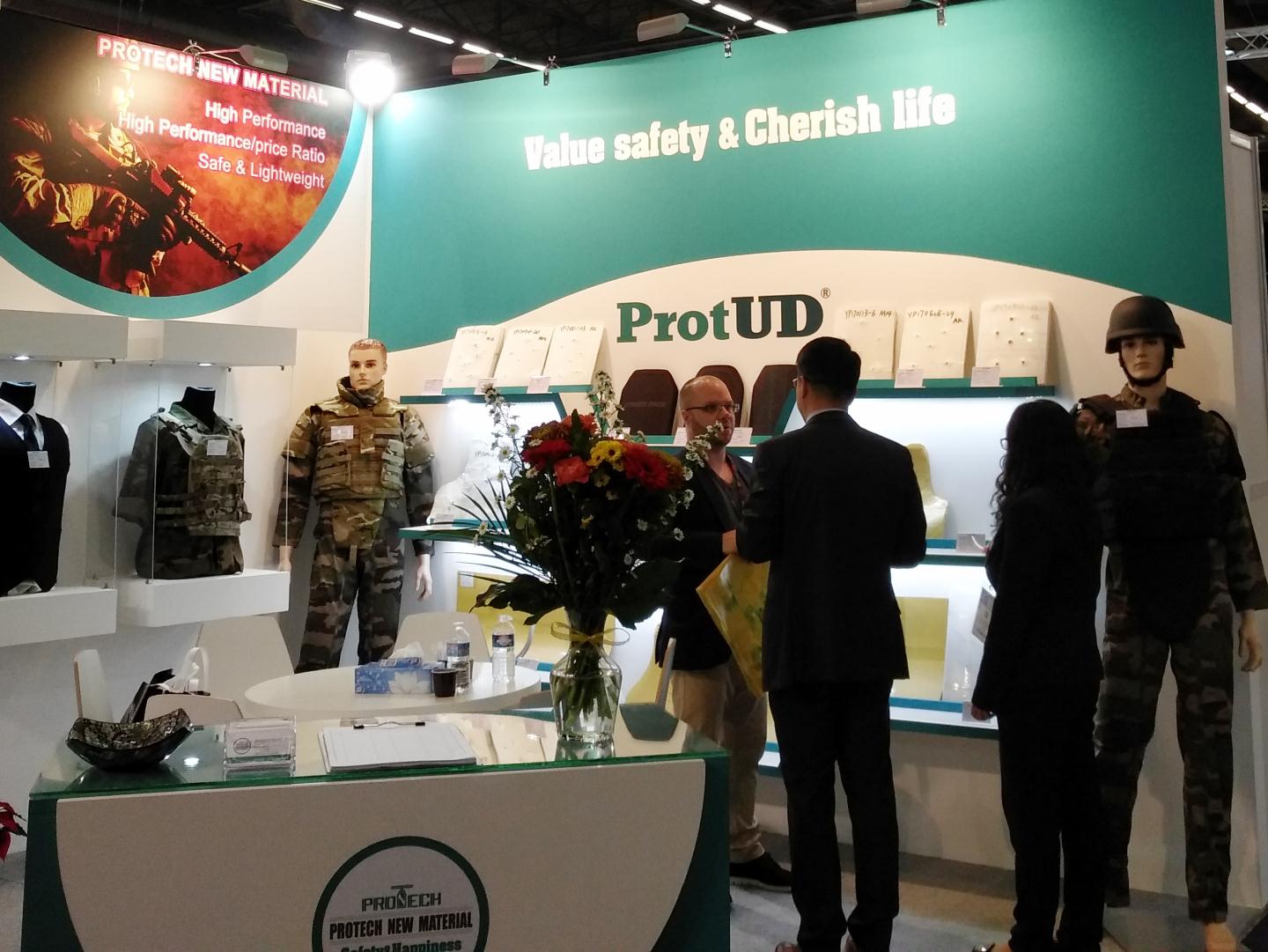 During four days of the exhibition, there were many Suppliers, Buyers and Experts in the military and police field came together from the world to discuss the new security issues and solutions and to explore the new security technology and equipment materials, etc. Protech showed its ProtUD® materials and downstream products that draw continuous attention and high recognition from the professional visitors. The high-end material of ES435 was displayed for the first time which attracted a lot of professionals by its advantages of much lighter, easily machined and good anti trauma performance. Another product of KUD01 produced by Dupont Kevlar fiber also drew great attention from many customers as its more excellent ballistic performance than other similar aramid products.